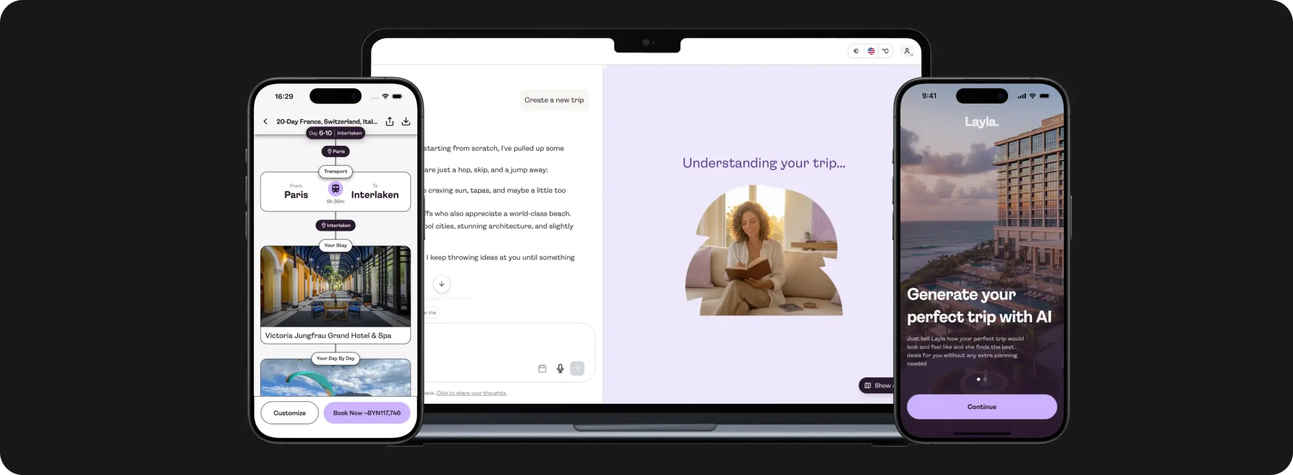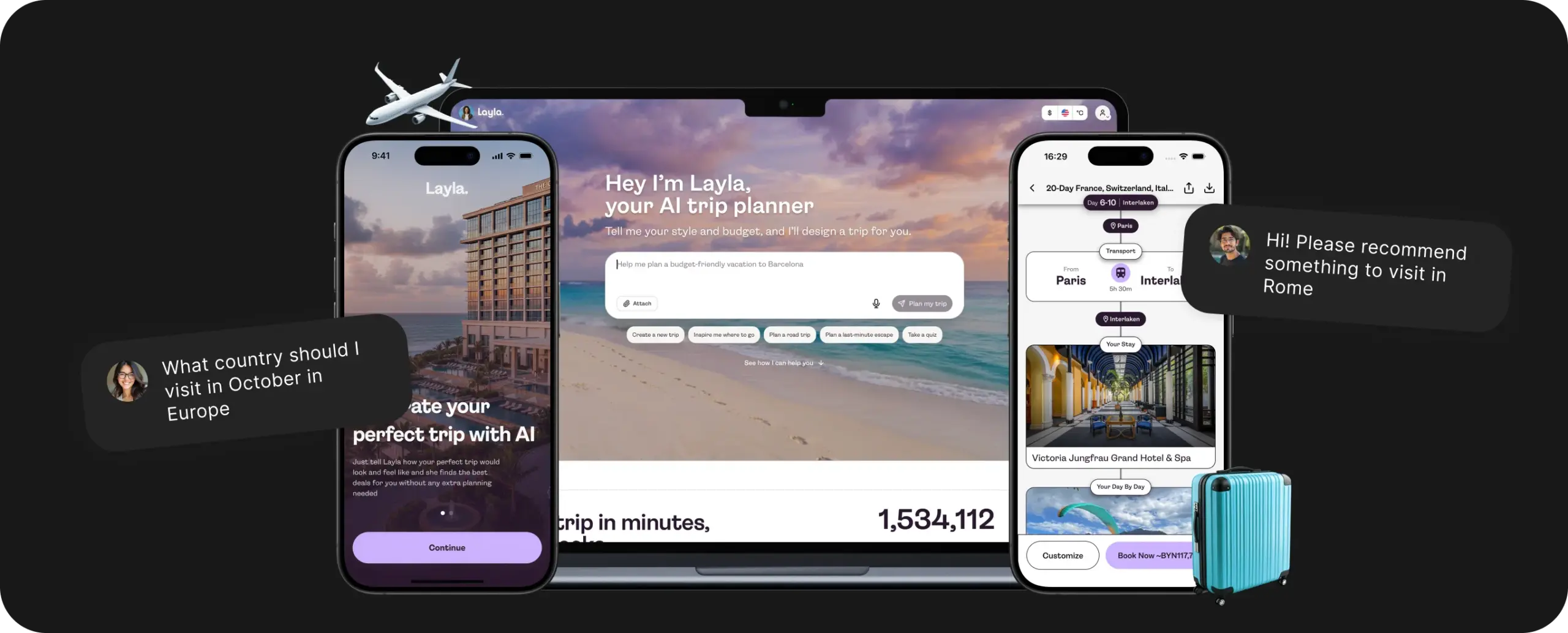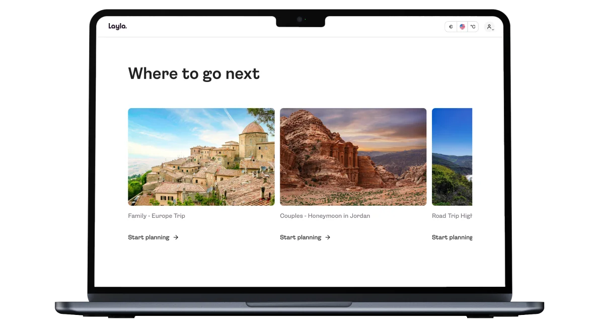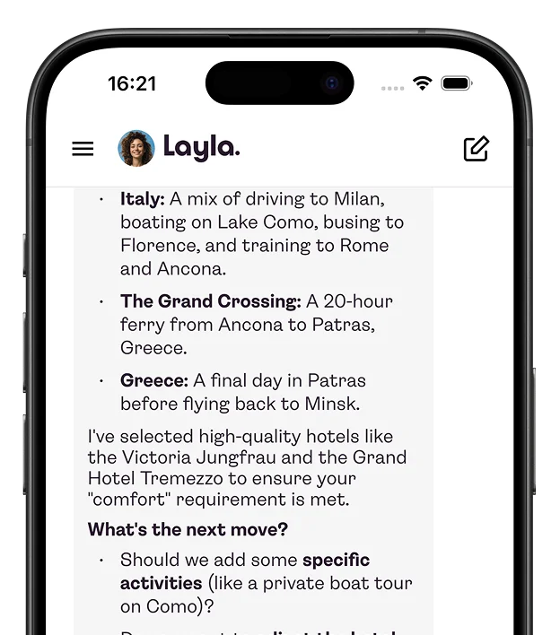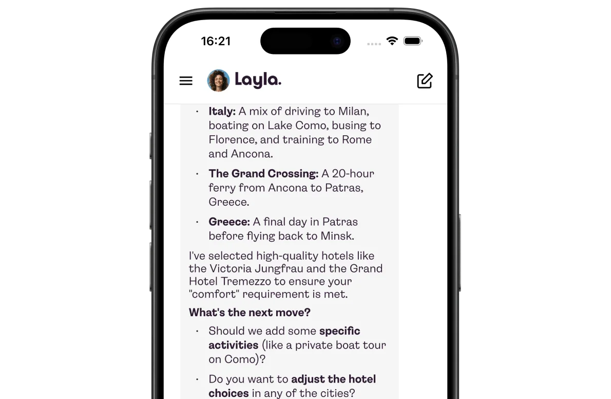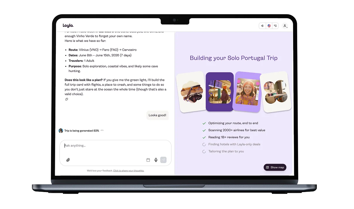 Layla works as a single conversational layer over the full trip planning process. Users type what kind of trip they want (destination, dates, budget, preferences), and the AI returns a structured itinerary with flight options, hotel matches, and local recommendations. Getting the AI to that point took serious work: reducing hallucinated travel data, improving response relevance, and keeping multi-turn conversations coherent through prompt engineering, context management, and ongoing QA.